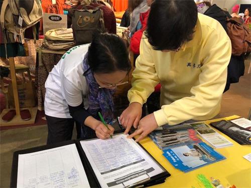 另一位女士跟学员介绍自己在中国住了十年,她知道在中国发生的很多事情。她也知道法轮功学员在全世界征集签名,停止中共的迫害。临走前她向学员索要了更多的资料,她说想帮着发给自己认识的人。