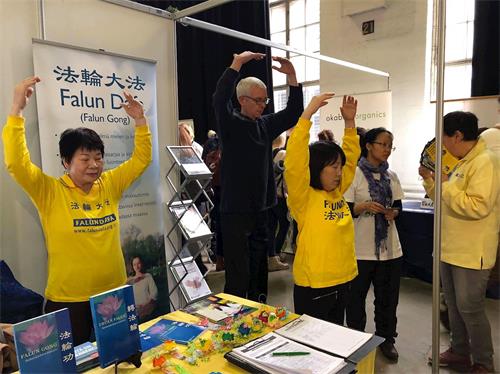 法轮大法的展位让很多路过的人感兴趣,有些人在前几届的展会上已经得到过大法的资料了,这次他们来专门签名支持法轮功学员反。有位年纪大的女士以前练过瑜伽,她看到法轮功第五套功法,想知道怎么样才能像学员那样平和的打坐那么长的时间,走前她询问了炼功点,她表示一定会去学功。