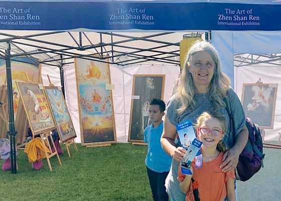 法轮功学员应邀参加了奥克兰库姆表演展览节,展位上挤满了人。腰鼓队的功法展示和表演让人驻足观赏,真善忍画展静静地讲述着在中国发生的真实故事。