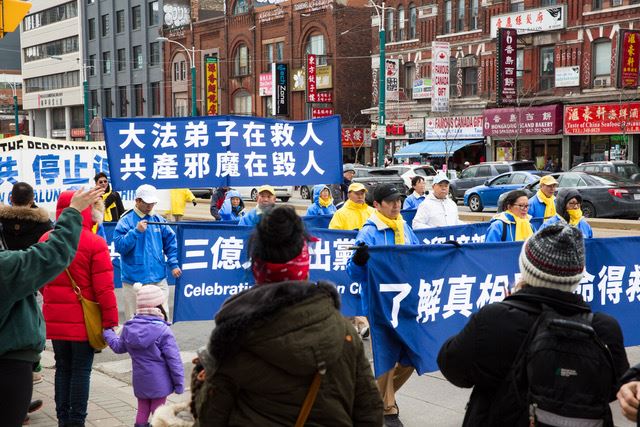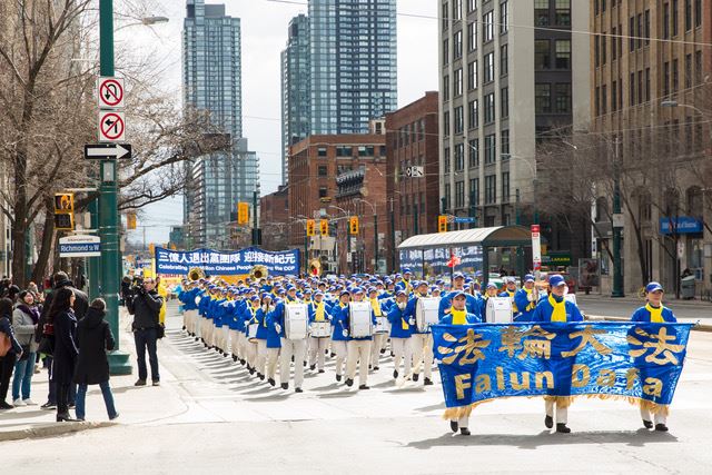 游行队伍的主题横幅是“三亿人退出党、团、队 迎接新纪元”。浩浩荡荡的队伍由三大方阵组成:第一是“法轮大法好” 方阵;第二是停止迫害方阵;第三方阵是迎三亿中华儿女三退大潮。队伍由雄壮的天国乐团开道,途径经多伦多中区唐人街和市中心的繁华商业街皇后大街,最后回到克拉伦斯公园。当天阳光明媚,沿途观众有表示支持的,还有华人观众现场做了三退,很多西方民众表示非常支持法轮功。