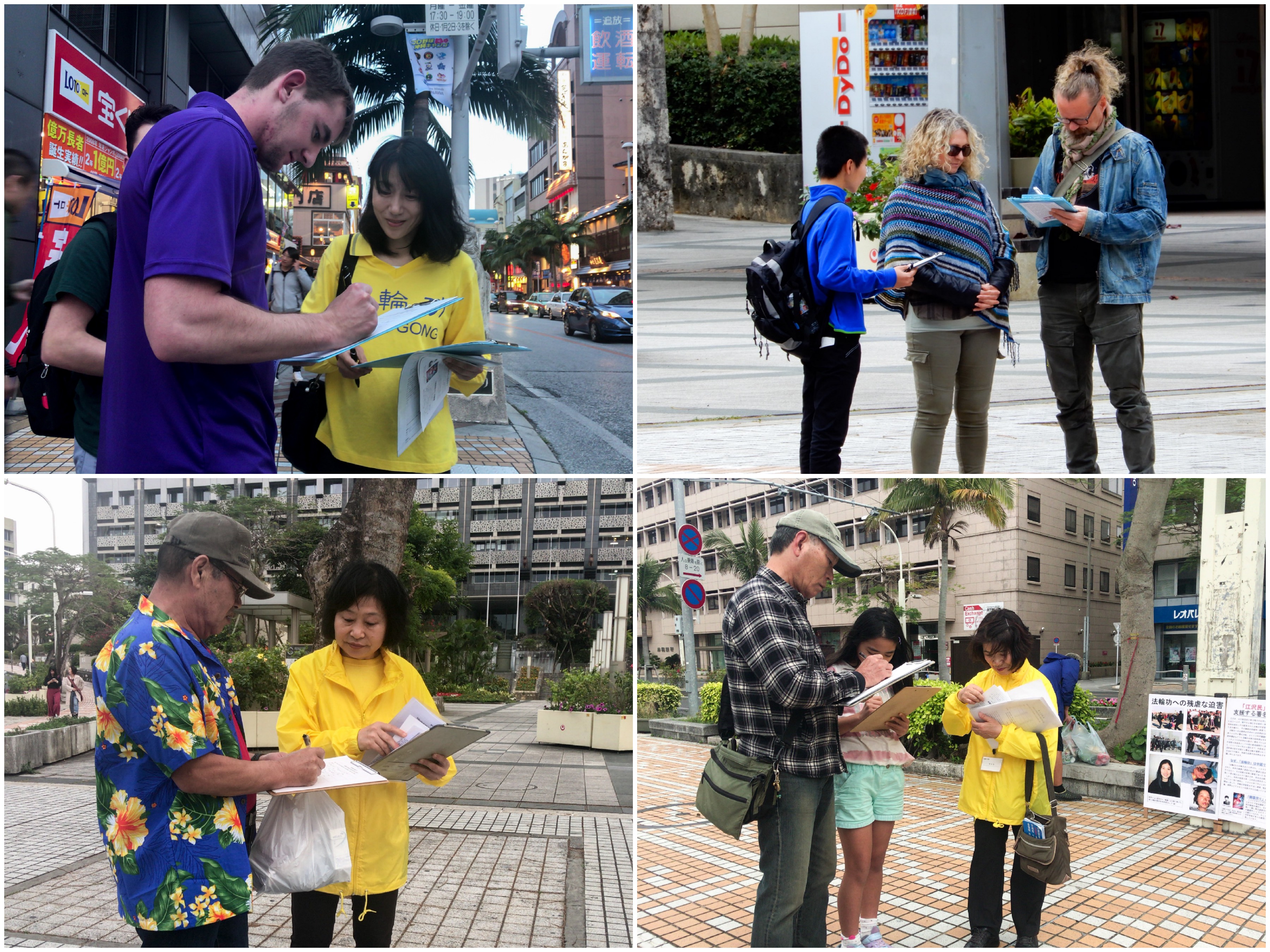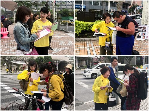 冲绳县富有独特的自然环境,气候温暖宜人,有“日本的夏威夷”之称,吸引众多海内外游客。因此,一年四季涌入不息来自世界各地的旅游客。为了使有缘的海外旅游客了解法轮功被迫害的真相,学员们除了日文和中文之外,还准备了英文、越南文、尼泊尔文、韩文等多语种真相资料。特别是学员们打开横幅和使用扩音器向日本民众呼吁声援诉江联署不仅仅是对过路行人,连等信号灯的很多车辆司机和乘客也都能听得到响亮的真相说明。了解真相的很多民众主动接过真相资料,并毫不犹豫的签名支持诉江。