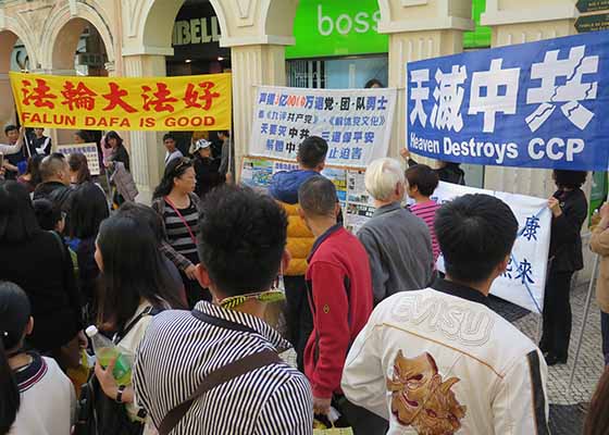 三月十一日下午,澳门法轮功学员在市中心步行街举行集会,声援三亿中国人认清中共的邪恶本质,声明退出共产党、共青团及少先队(简称三退)。