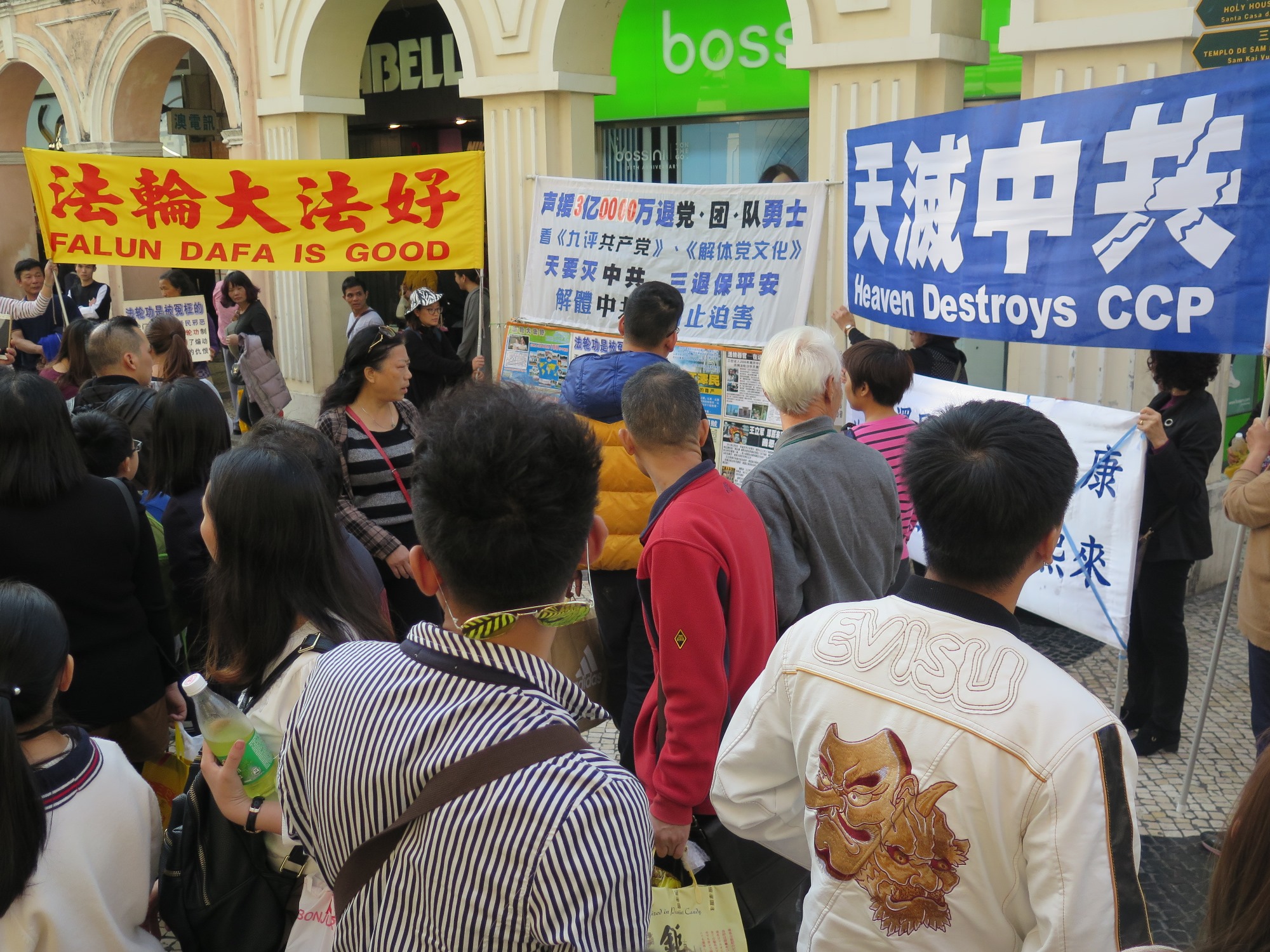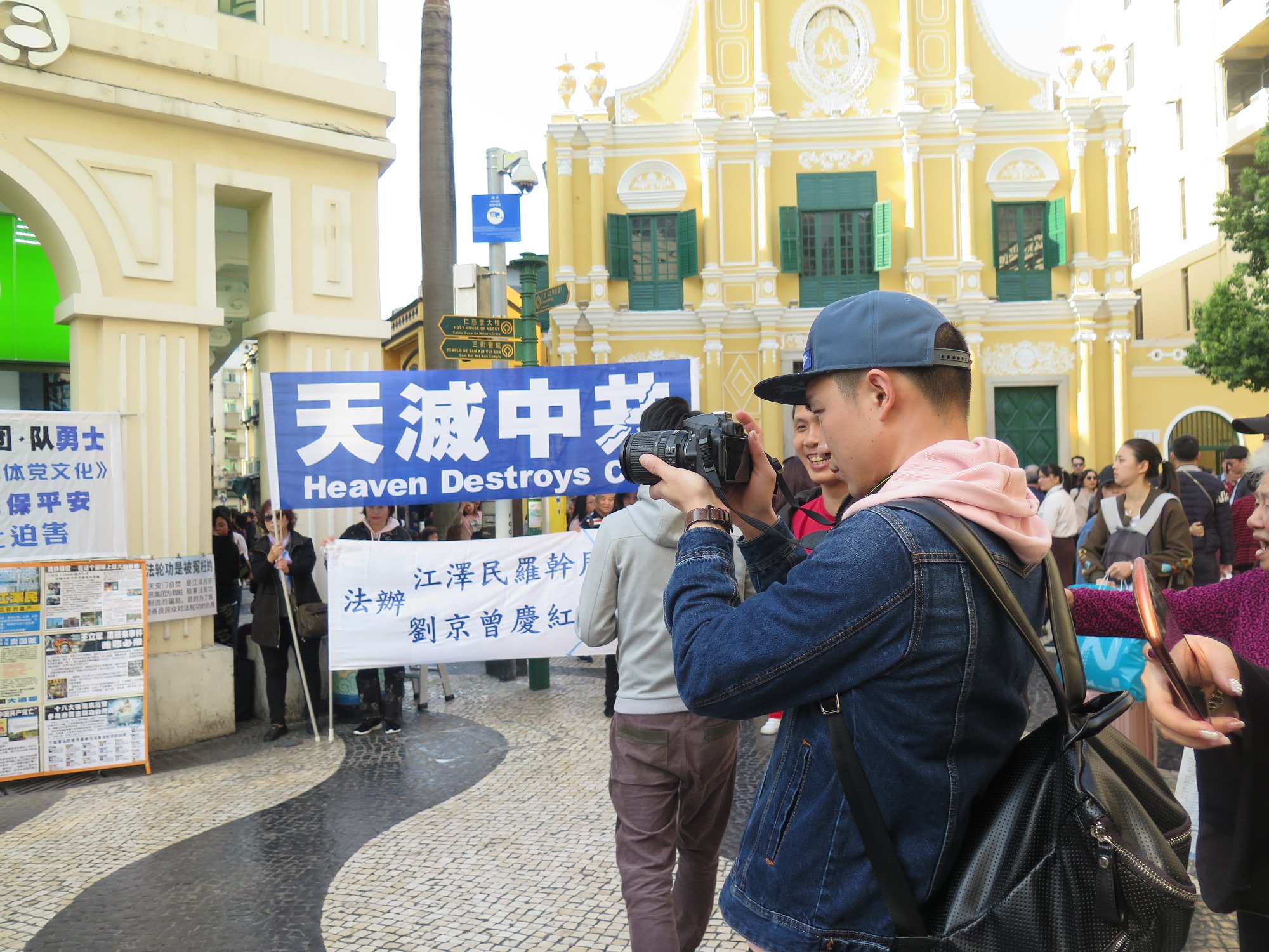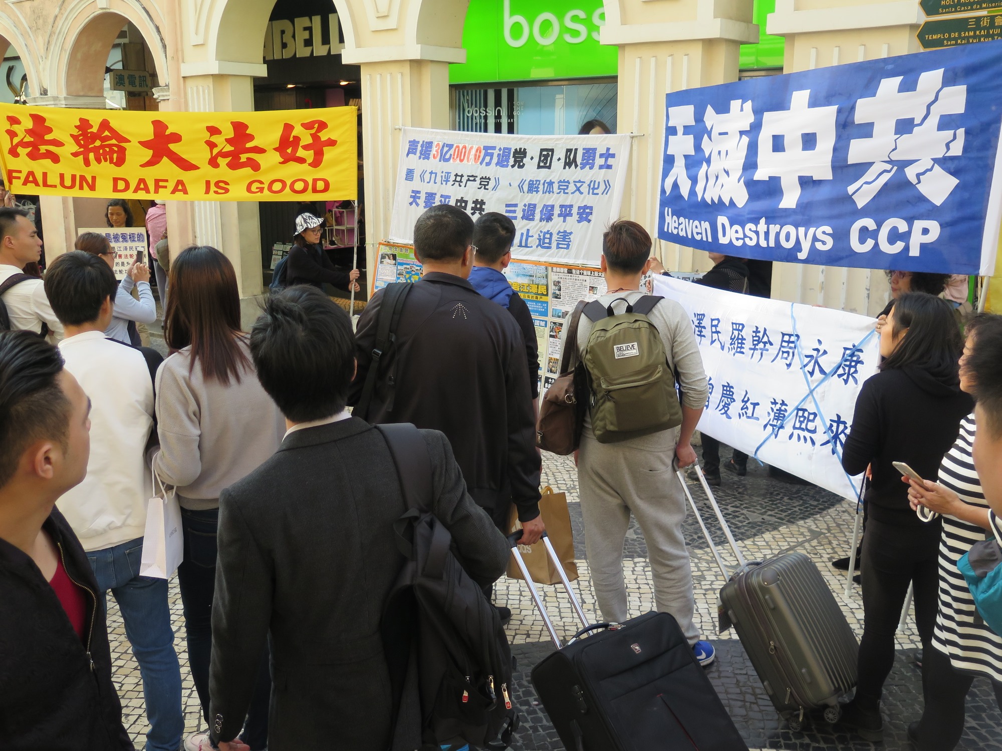 集会开始,横幅一打开,大批的大陆游客马上走过来看。当他们看到“声援三亿退 党、团、队勇士”、“天灭中共”、“法办江泽民、罗干、刘京、曾庆红”及“法轮大法好”的横幅时,都露出惊讶的表情。有的表示:“如果不来澳门,就不知道什么是言论自由。”有的说:“我们在大陆,怎么可能看到这些?!”不少游客大声念:”天灭中共”、“法轮大法好”。 有更多的游客不停地拍照,把每一张真相图片及横幅都一一照下来。