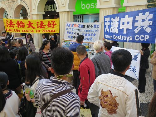![]() 图1~3:澳门法轮功学员举行声援三亿民众三退活动 |