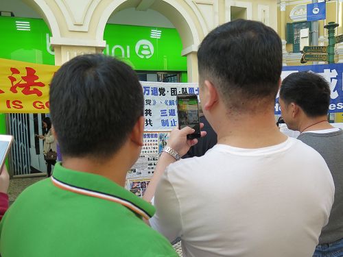 图4~5:大陆游客拍摄法轮功真相展板 |