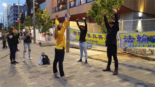 当晚的灯节也吸引了众多华人家庭,许多年轻夫妇带着父母和孩子来感受中国元宵灯节的气氛。来此邂逅法轮功,看到热情的学员们,又见到众多游人驻足模仿学炼功法动作,他们有的不禁停下脚步、认真看大法真相横幅,也有的跟着模仿炼功动作。一位老年华人还对学员竖起大拇指,大声夸赞:“法轮大法好啊,法轮大法好!你们真是好样的!”