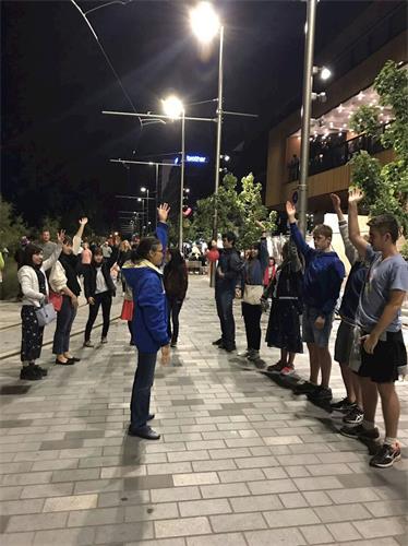 随着夜幕降临,舞台上的节目表演结束了,空气中也开始透着丝丝寒意,可人们的学功热情丝毫不减,在法轮功学员的耐心帮助下,认真学习炼功动作,感受大法的美好。连续两个晚上,学员们都教功至十点半才结束回家。