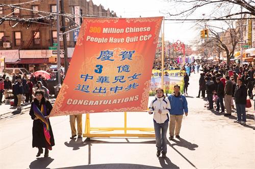 '近3亿人的三退大潮,代表这场波澜壮阔的中国人摆脱共产邪灵的精神觉醒运动进入了一个新的历史里程。图为2018年2月17日,纽约中国新年大游行退党中心方阵。'