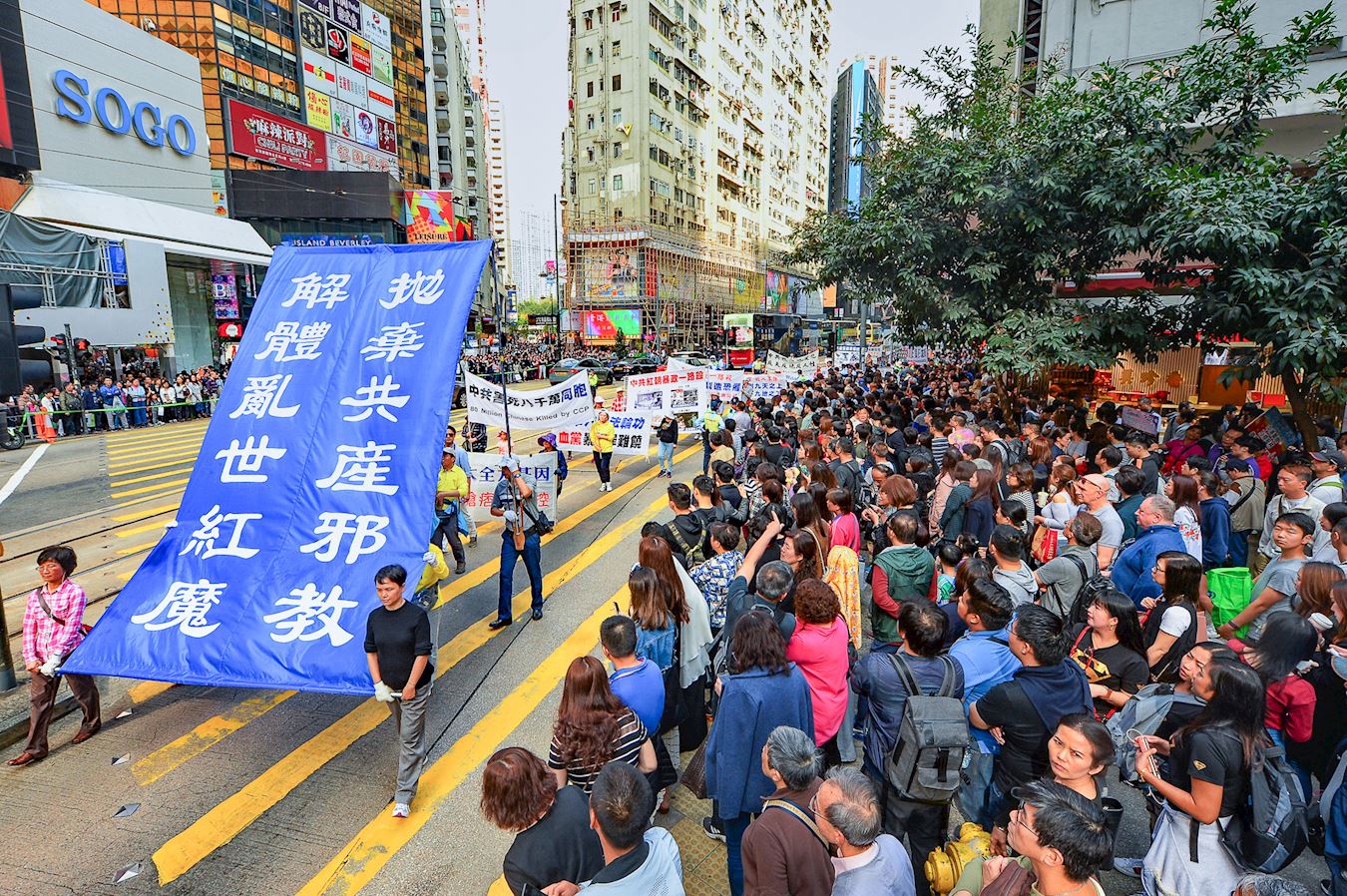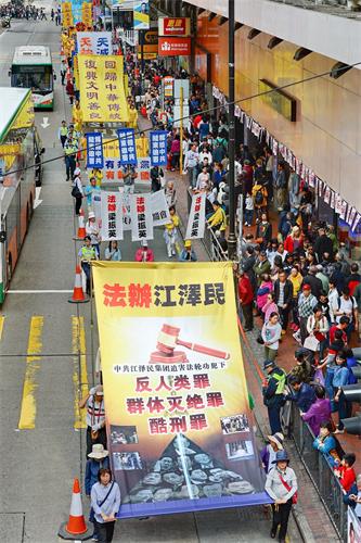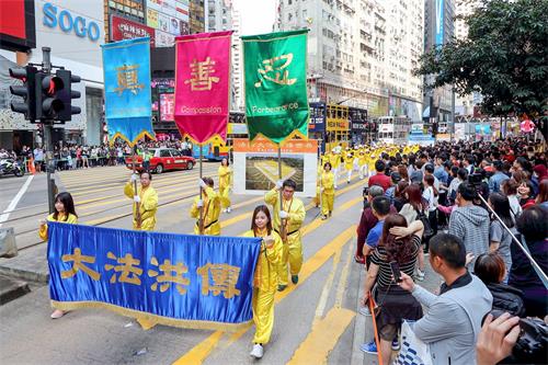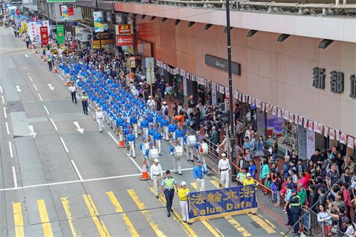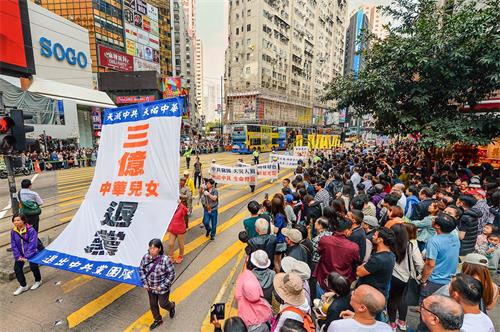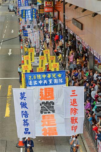 约七百人的游行队伍下午二时从北角英皇道游乐场出发,沿着港岛区主要街道前往终点西环中联办,途经铜锣湾、湾仔、中环多个购物热点。游行由天国乐团领头,有“三亿三退 普世同庆”、“法轮大法洪传世界”、“和平理性反迫害”、“天灭中共 三退是福”等六大方阵,并有腰鼓队、旗鼓队等表演,吸引许多香港市民和大陆游客驻足观看,他们纷纷以手机拍下游行的场面。