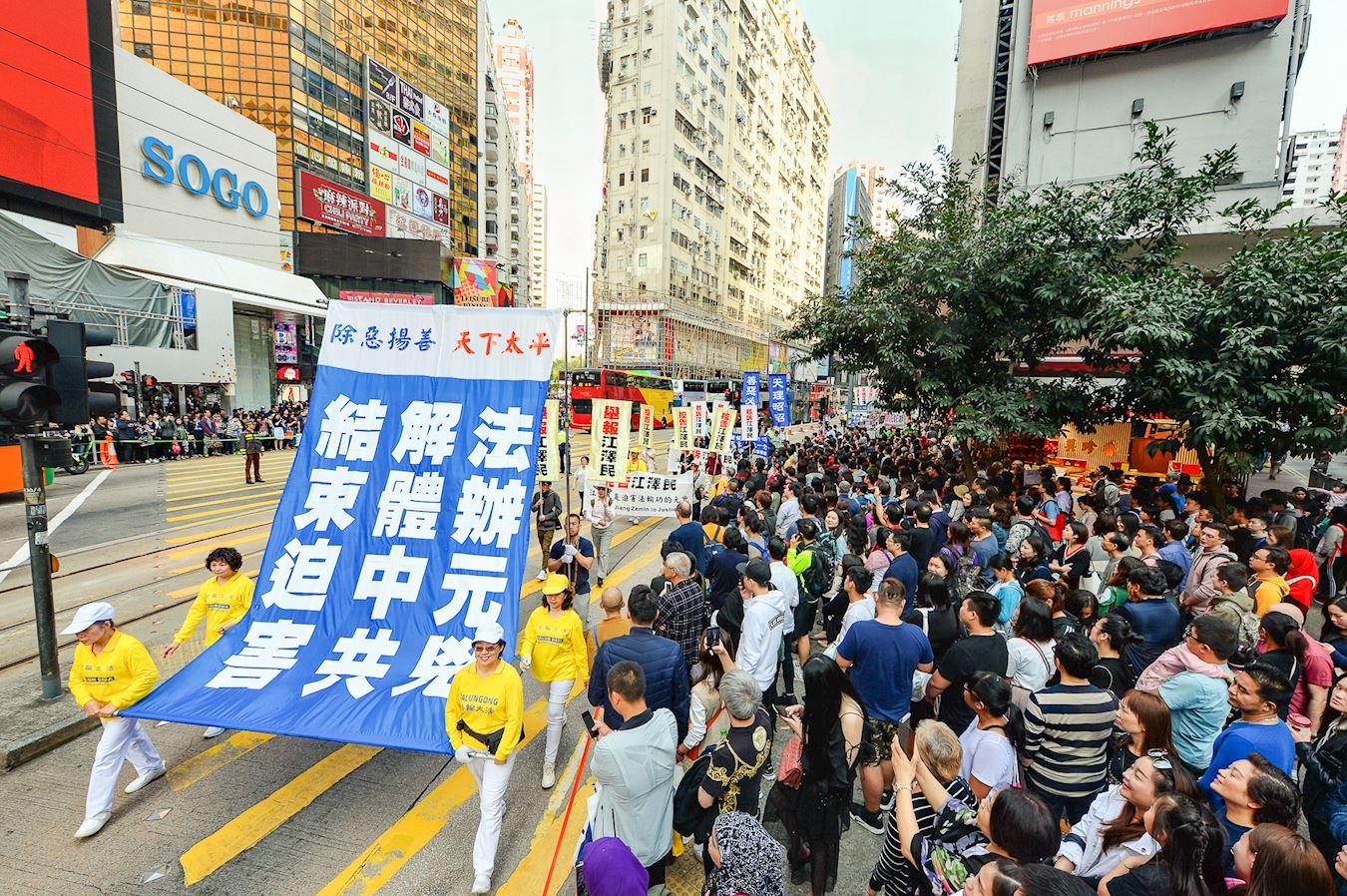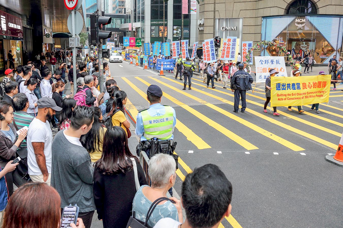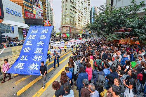 下午二时从北角英皇道游乐场出发,沿着港岛区主要街道前往终点西环中联办,途经铜锣湾、湾仔、中环多个购物热点,吸引许多香港市民和大陆游客驻足观看,了解真相,他们纷纷以手机拍下游行的场面。