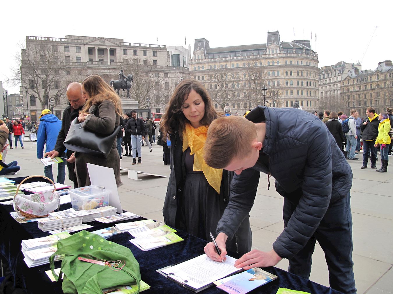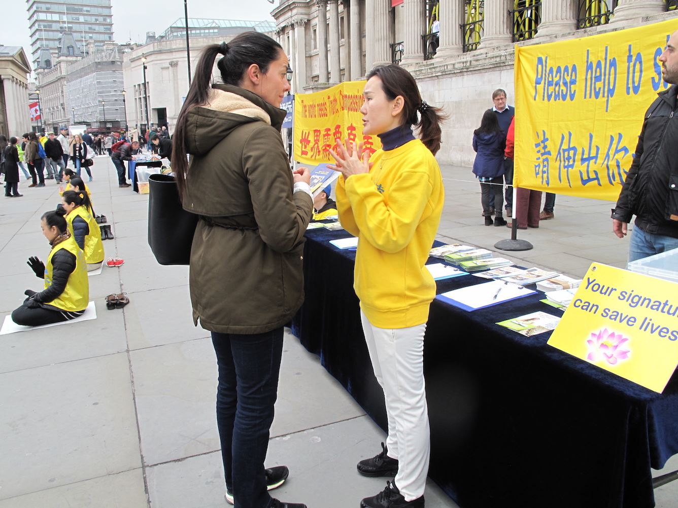 ![]() 图11:英国法轮功学员蒂丽•尼斯比特(Tili Nesbit)向一位荷兰青年讲真相,这位青年签名反对中共迫害。 |