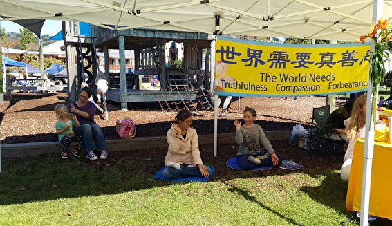 Rudolf Steiner School位于基督城东的山脚下,紧靠Hansen Park.Heathcote River蜿蜒流过校园外围,四周环境美丽幽静。丰收庆祝节上,校园的草地上各种各样的摊位早已搭好,法轮功学员搭起了遮阳篷,布置好了教做莲花需要的一切材料,以及相关的真相展板,吸引了来逛集市的儿童与家长们的注意。