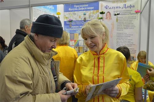 法轮功在展会上不止吸引了普通民众,还使几位同样参展的人们也很感兴趣,他们和学员们攀谈了很多,并且拿了资料,想要更深刻的了解一下。其中一位年轻男士和学员聊了很久,最后说到:“法轮功比其它的气功高多了。”