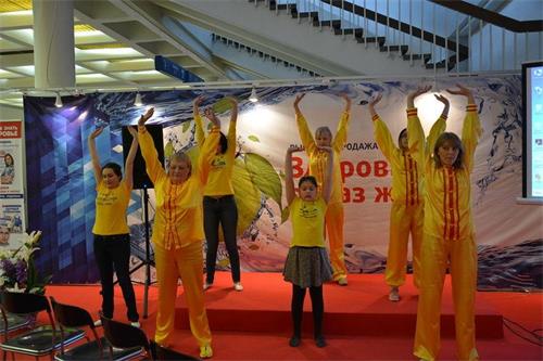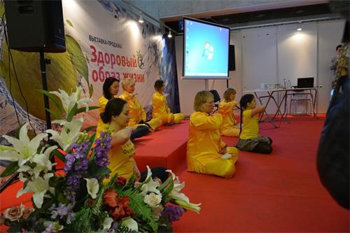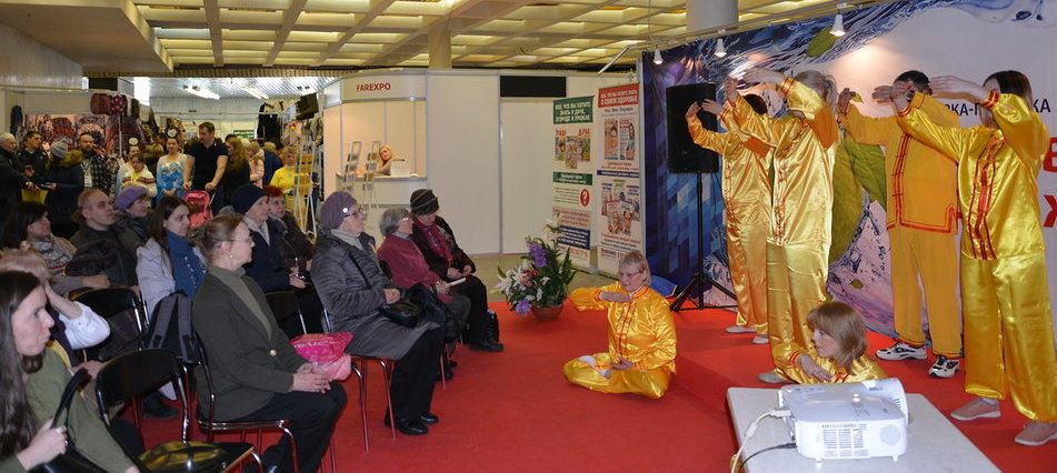 在展会上举办了两场法轮功功法展示,场内的观众满满的,非常专注的看着学员们。听说会后可以报名参加学员组织的学法和义务教功,很多民众积极报名想要参加。