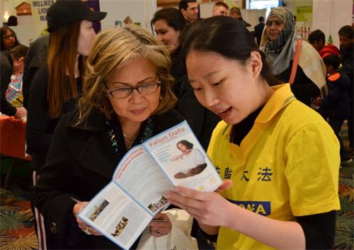 当天的活动中法轮功学员不仅向民众介绍法轮功,还在现场展示功法。他们炼功时的宁静祥和吸引了很多民众驻足。来自万锦市致力于社区服务的诺沙德·赫吉先生(Naushad Hirji)和学员交流中表示,很震撼于法轮功学员炼功时强大的能量场。他留下自己的联系方式并表示:“我希望给你们提供一个场地,专门教授社区的人们来炼法轮功。”