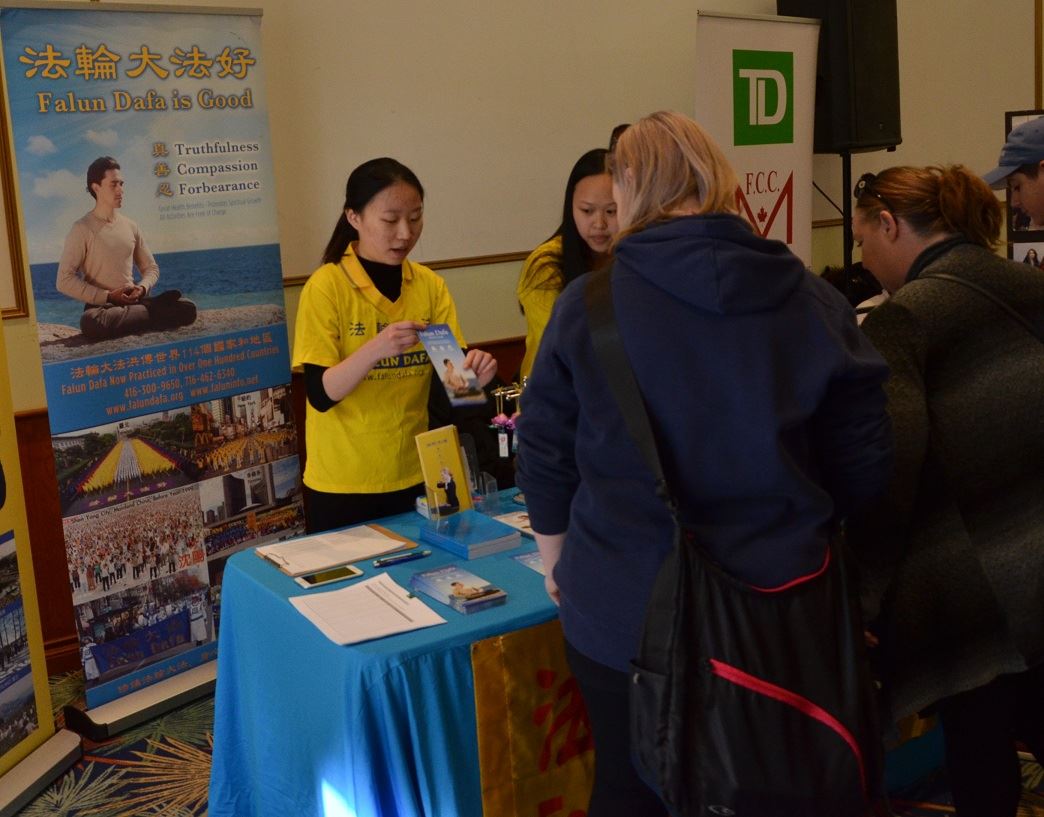 在加拿大留学的刘先生看到法轮功的展位后走上前来拿取介绍法轮功的资料,他告诉学员自己曾在海外旅游的时候见到过法轮功学员向游客讲真相,在海外看到的法轮功和在大陆媒体宣传中的完全不一样,今天希望更进一步了解。学员告诉他,法轮功修炼真、善、忍,让人去做个更好的人。在中国大陆没有迫害前,法轮功曾多次获得官方表彰,在海外也已获得各个国家政府的褒奖超过三千多项。离开展位前,刘先生表示他很高兴了解到这样多的讯息,还向学员表示感谢。