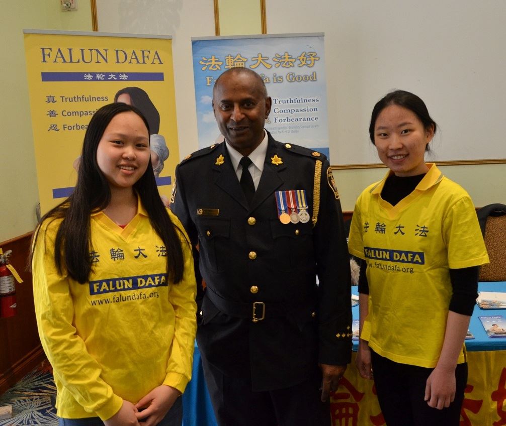 约克区警察局的督察瑞奇·维若潘(Ricky Veerappan)先生看到法轮功的展位后高兴地向学员们打招呼:“法轮大法,谢谢你们来参加这个活动,你们对这个位置满意吗?有什么要求告诉我,我去帮助你们安排。”瑞奇先生还和法轮功学员分享了他了解法轮功的过程以及同法轮功学员多年来的沟通与合作。他谴责了中共对法轮功的迫害:“那种迫害在加拿大是不允许的,我们的职责是保护我们的社区、保护你们的权利、保护你们的信仰。法轮功在加拿大理应获得保护。”
