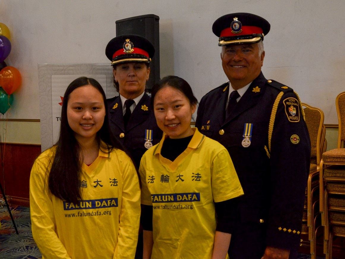 图3:约克区警察总长艾里克·乔里夫(Eric Jolliffe,左二)与法轮功学员合影