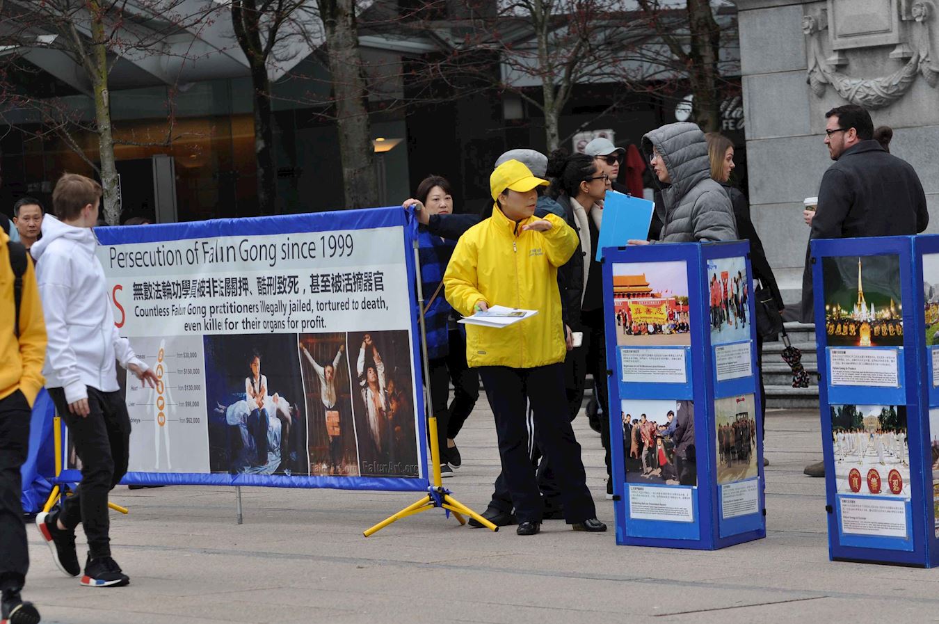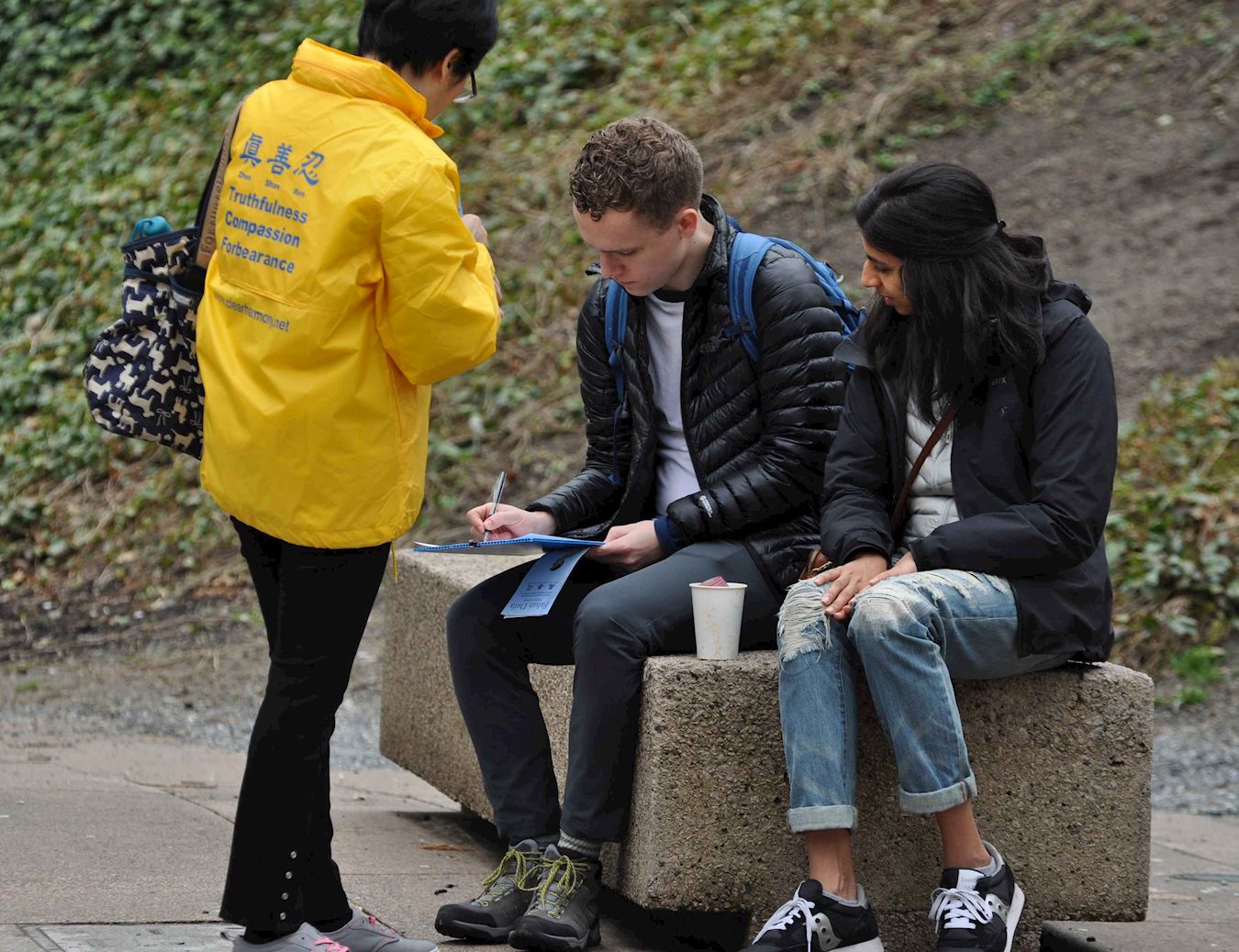 温哥华艺术馆是市中心,过往人群络绎不绝,尽管当天下着小雨,仍然有很多行人被法轮功学员的活动所吸引。很多人在了解真相后,赞扬法轮功学员坚持“真、善、忍”信念的勇气,同时谴责中共的恶行,并为营救孙茜签名。三小时征得一千人的签名。