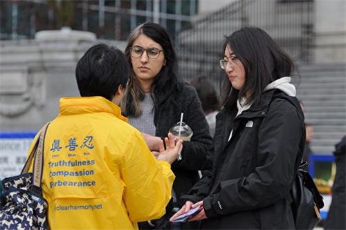 一位中东地区的女士路过艺术馆前,看到法轮功学员摆出的展板等信息后吃惊地说:“法轮功修炼者被中共迫害的事我听说过,但是看到活摘器官的图片和内容,我很震惊,这是真的吗?”法轮功学员详细地向她讲解了中共迫害法轮功学员的暴行后,这位妇女当即就在营救法轮功学员孙茜的征签表上签下自己的名字,表达她的声援。之后,她说:“这太不可思议了,我会为你们祈祷。”