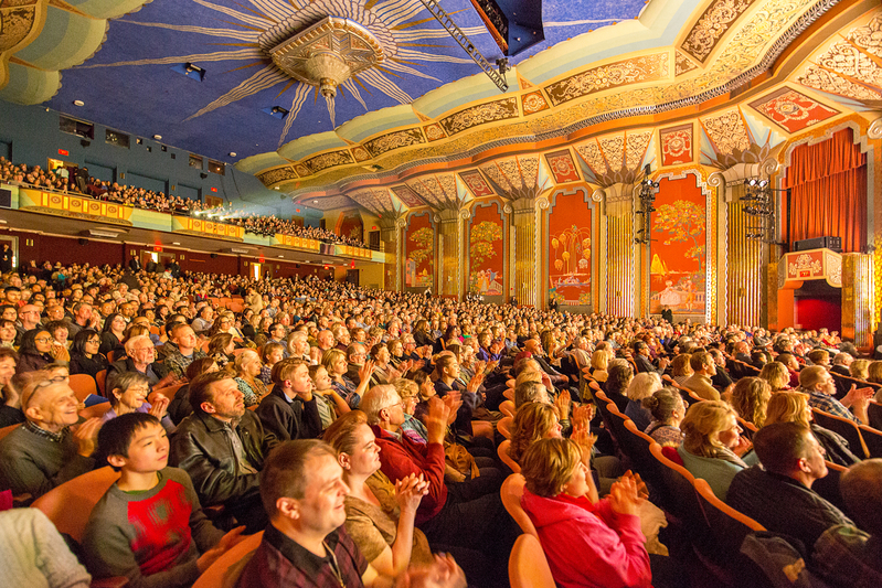 图1:神韵巡回艺术团二零一七年四月五日至八日在芝加哥西郊奥罗拉市(Aurora)派拉蒙剧院(Paramount Theater)一连上演了七场演出,包括其中一场加场,连连爆满、一票难求。图为六日晚场演出大爆满盛况。