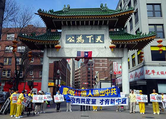 四月十四日,波士顿退党服务中心在波士顿中国城拱门处举行集会、海报展及腰鼓表演,声援三亿中国人退出中共,受到在场民众的支持。