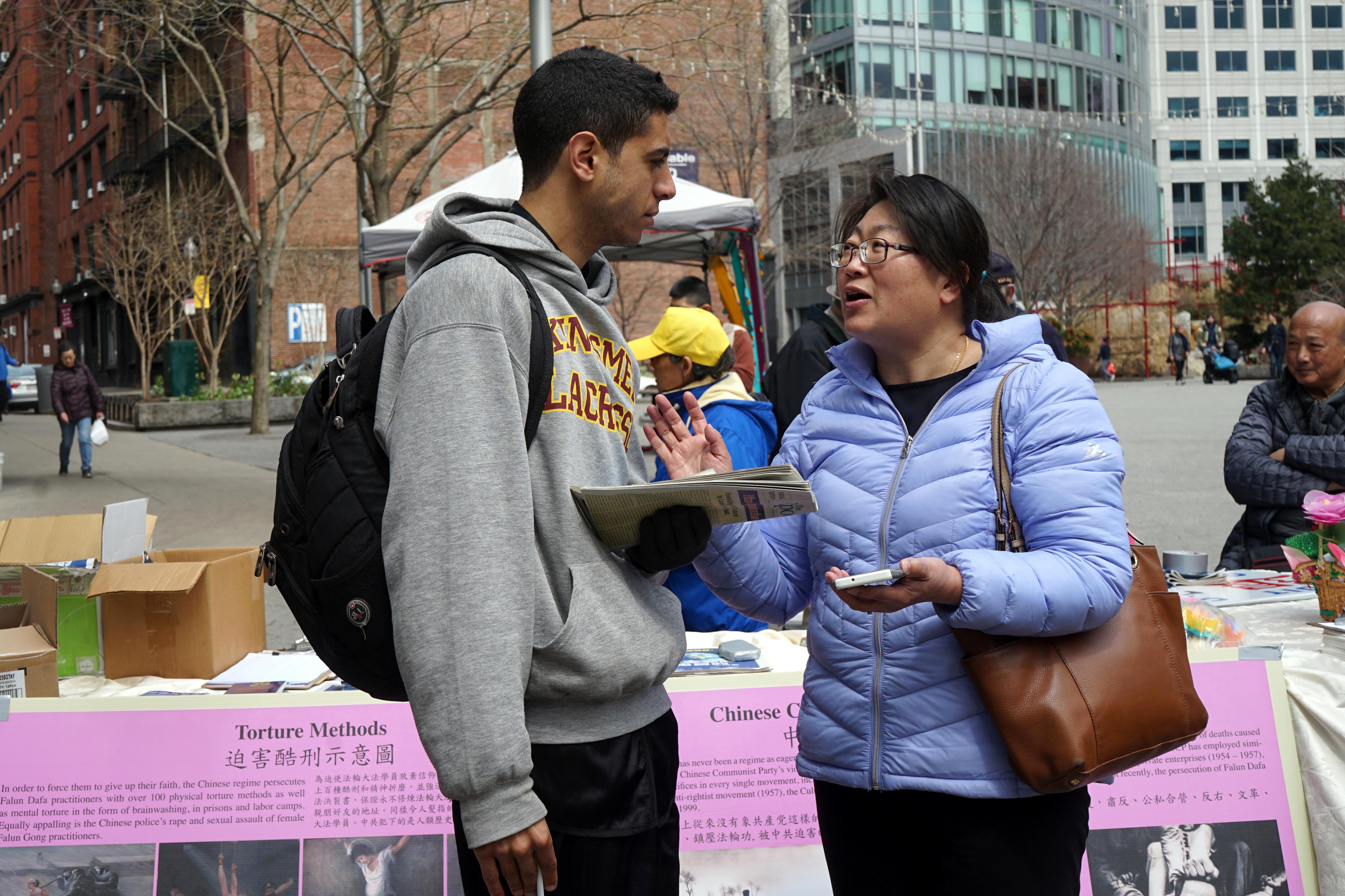 波士顿大学历史系退休教授比尔·圭瑞罗(Bill Guerriero),到展位上赞叹法轮功学员坚韧不屈的精神。在任教历史系时,他从网站上知道法轮功被迫害及大纪元的退党活动。他说:“我敬佩你们!支持三退反迫害活动!”