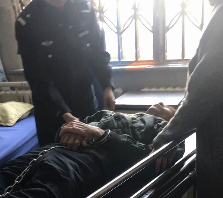刘福斌在泰来县医院手脚被手铐脚镣扣在床上