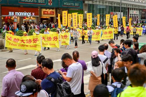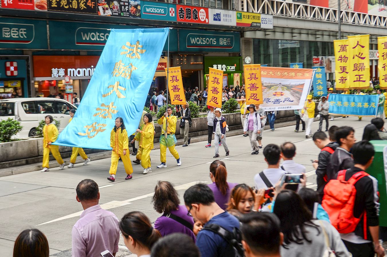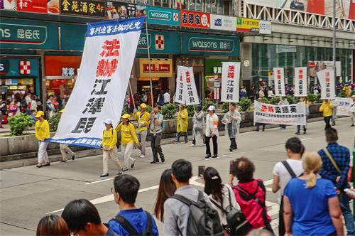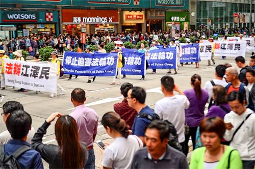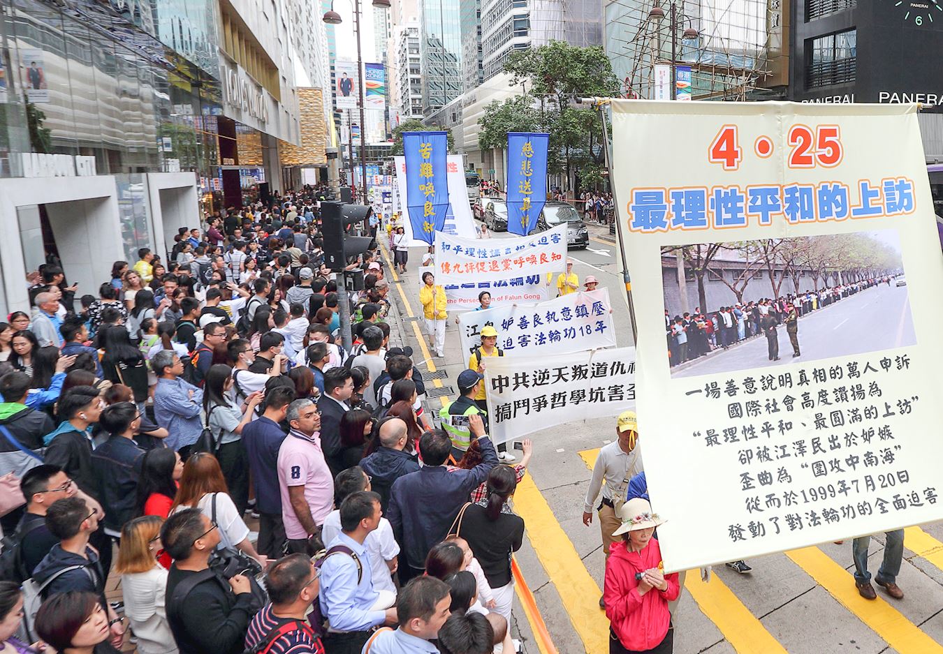 图2:四月十五日,香港、亚洲多个地区和国家的部份法轮功学员在香港举行纪念“四·二五”十九周年集会游行,场面震撼不少香港市民及大陆游客。
