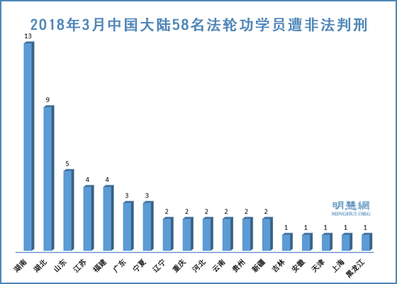 据明慧网信息统计,2018年3月又有58名法轮功学员被非法判刑,其中年龄最大的81岁,9人被判7~10年重刑,律师为14名法轮功学员做无罪辩护。
