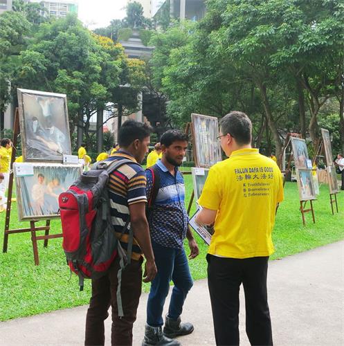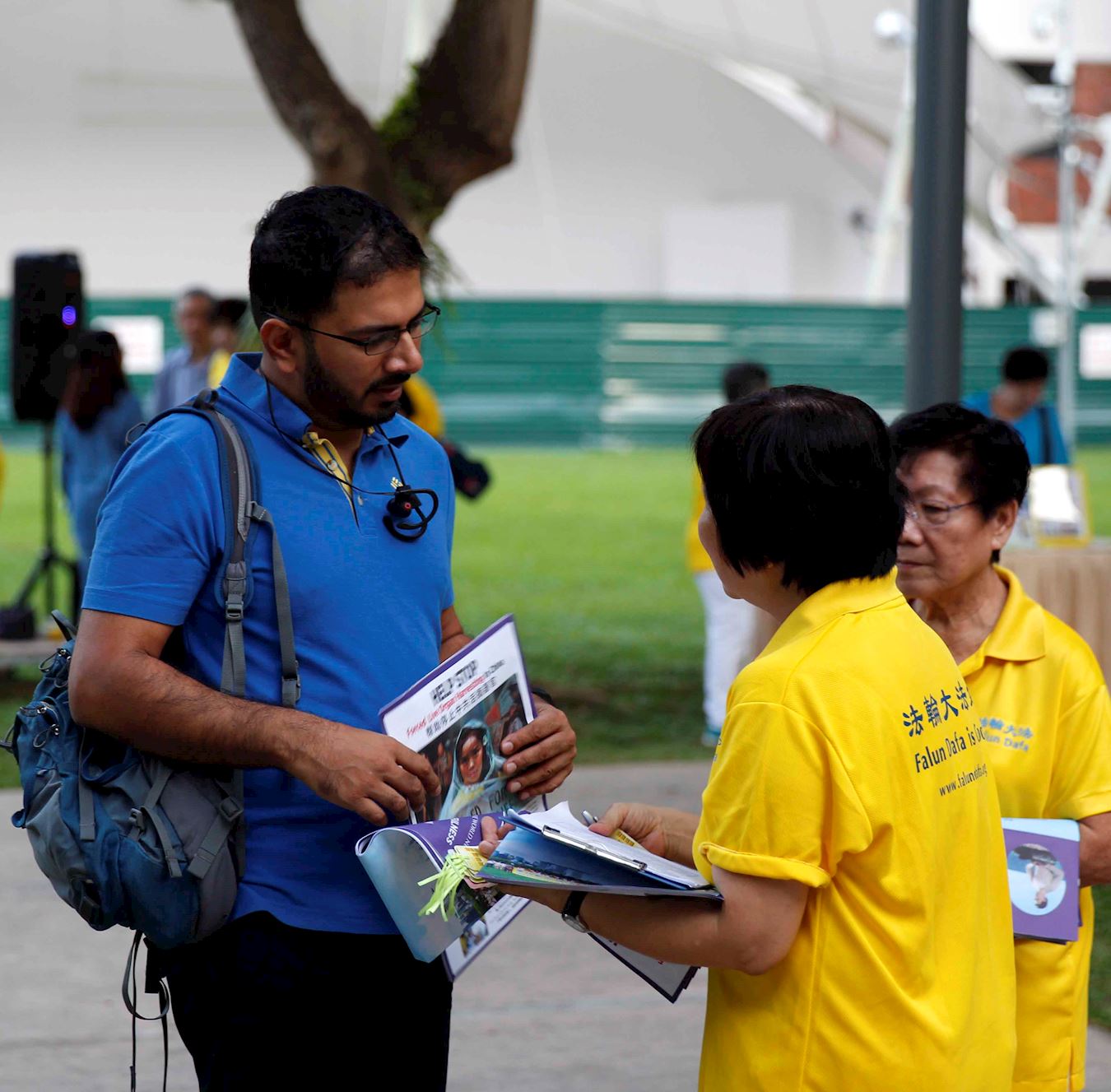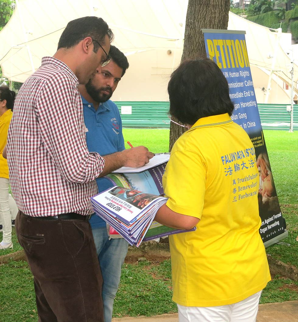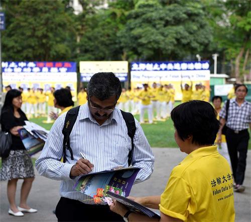 来来往往的行人中除了新加坡本地人,还有从世界各地来此读书、工作、旅游的人。人们了解了法轮功学员十九年来坚持和平反迫害的真相后,纷纷主动在“呼吁制止中共活摘法轮功学员器官”征签表上签名,谴责迫害,支持学员们的义举。也有人与学员分享在自己国家看到的法轮功学员讲真相的情况,并表达钦佩之意。