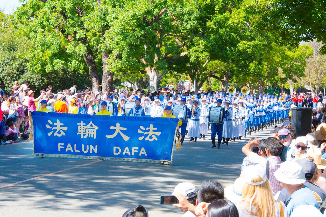 法轮功的队伍经过主席台时,主持人说:“现在来的队伍是法轮大法天国乐团,每个团员都修炼法轮大法。乐团的宗旨是展现法轮大法的美好。法轮大法是基于真、善、忍原则的自我提升的修炼,让我们欢迎法轮大法天国乐团。”观众报以热烈的掌声和赞叹。