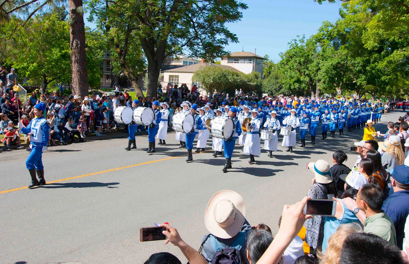 游行于上午十点开始,在《法轮大法好》、《神圣的歌》和《星条旗永不落》等嘹亮的乐曲声中,身着蓝白色古装的天国乐团出现在人们的面前,天国乐团所到之处,马上吸引了观众们的注意力,他们禁不住竖起大拇指,欢呼鼓掌。