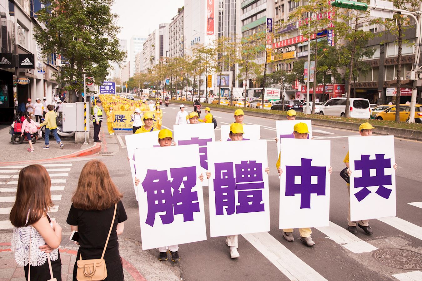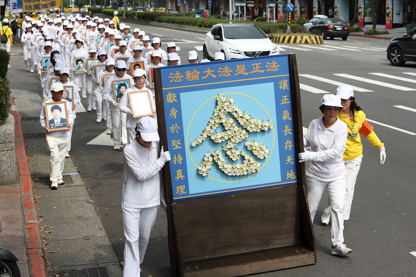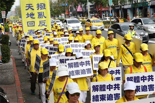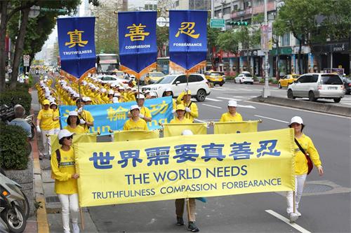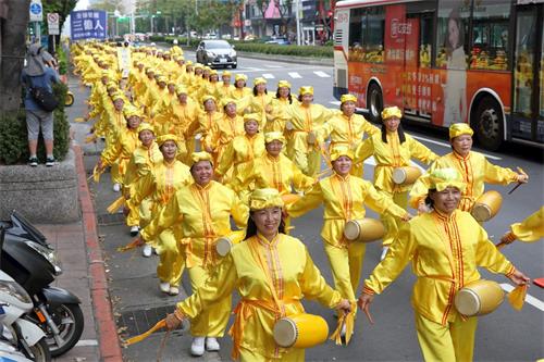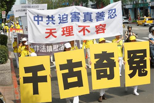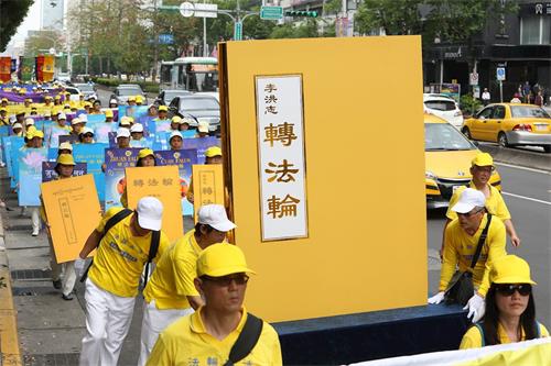 另外有两名从大陆来台湾出差的先生,在红绿灯看到游行队伍的时候表示,哇!法轮功团体在台湾的声势真是浩大。