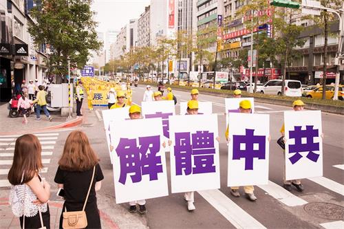 游行队伍开始之前,大约有三到四团的陆客团,在等红绿灯或者是在拍照一零一大楼以及台北市议会办公大楼。当他们行经法轮功学员队伍最前面看到解体中共的展板,露出非常惊讶的表情,有的就拿起相机拍摄现场的画面。