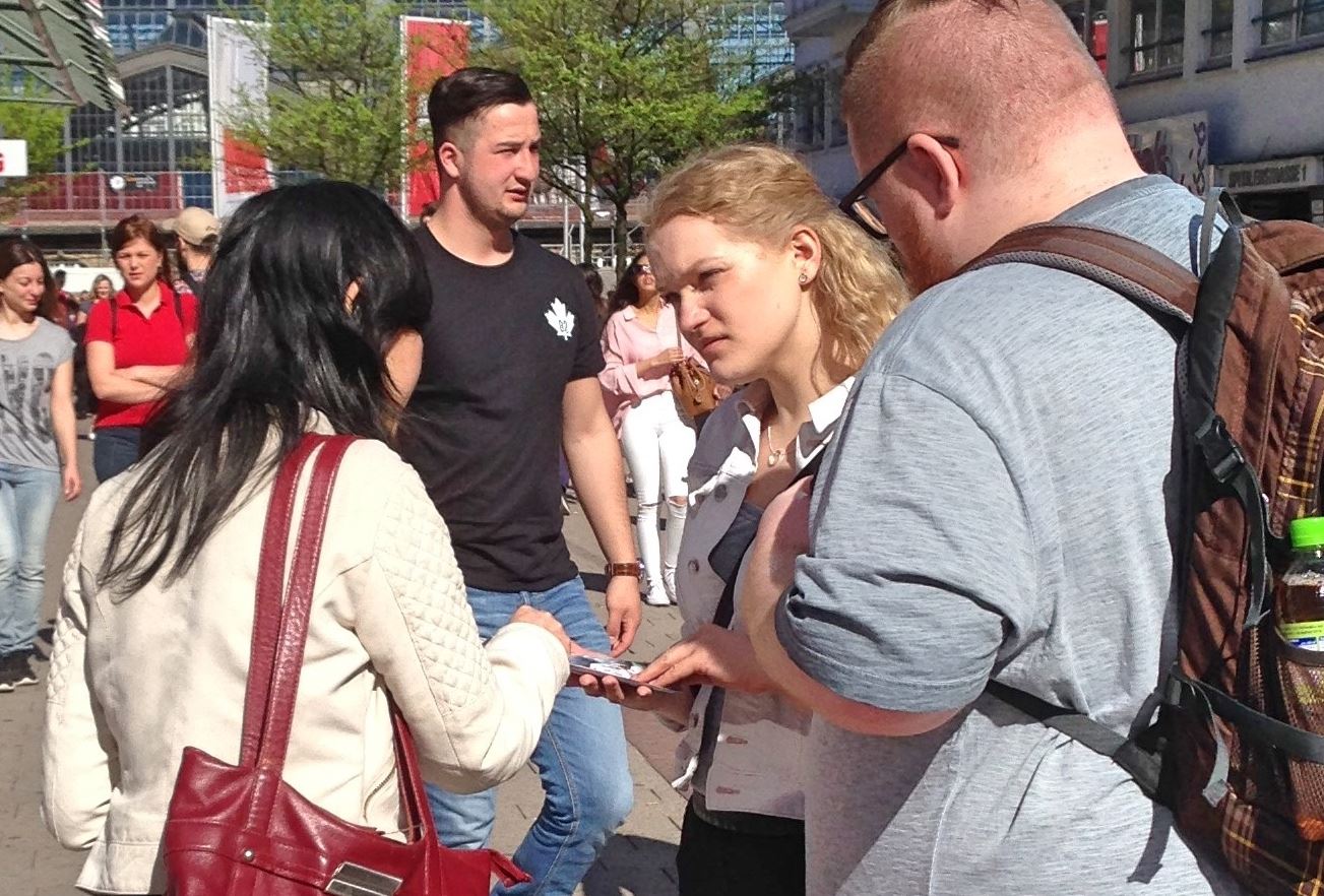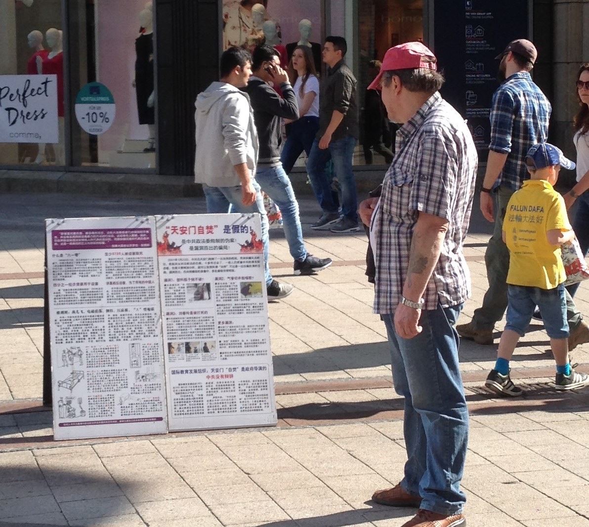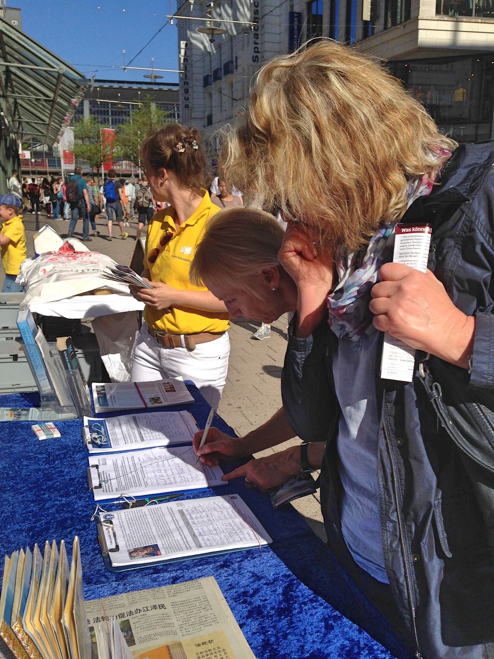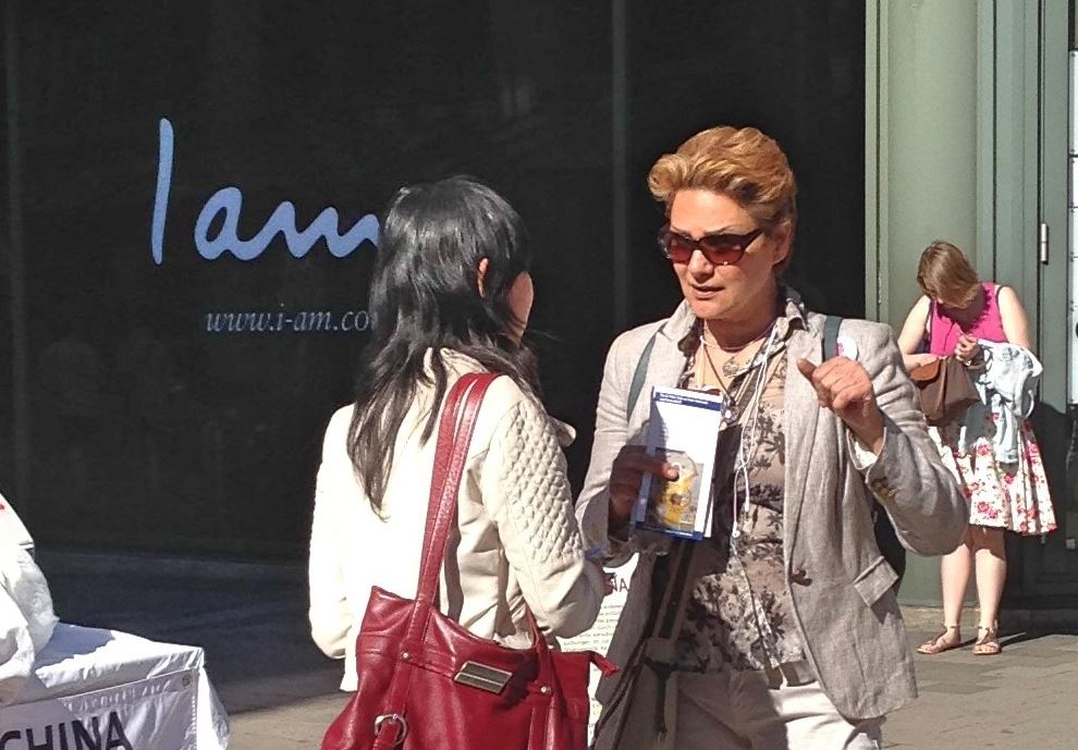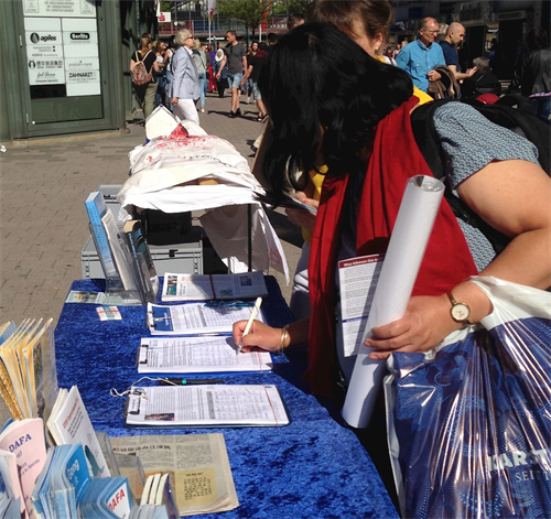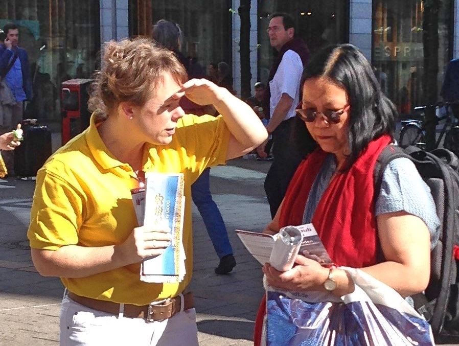 一位居住在汉堡郊区的女士非常高兴在信息摊位上又遇到了那位有过一面之缘的法轮功学员。她们曾在一家裁缝店偶遇,这位女士因此知道了法轮功并得到了法轮功的真相资料。但是后来她弄丢了真相资料,为此她一直都很懊恼。此次重逢让两人都非常惊喜。