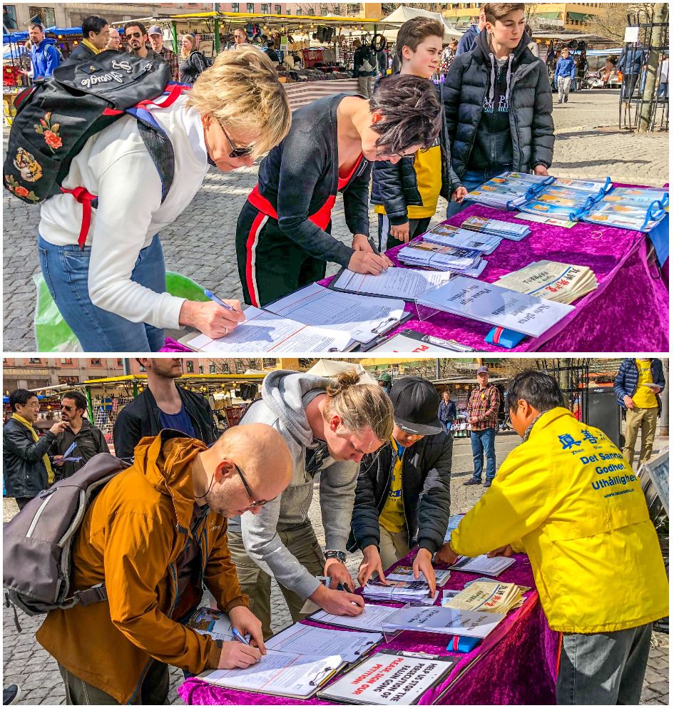 有两位瑞典中年男士一直在专注的听法轮功学员托比亚斯、温纳、杰森,他们透过扬声器用英、瑞文向来自世界各地的民众讲述四·二五经过和背景,揭露中共迫害法轮功学员以及活摘法轮功学员器官的罪恶,同时介绍三退(退党、退团、退队)大潮。两位先生听明白了真相后,主动走过来签字,表示支持法轮功学员反迫害,还对学员说:“真没想到中共这么坏啊!如果你们不把这些事(活摘器官)揭露出来,正常人简直是想象不到、不敢相信的。”
