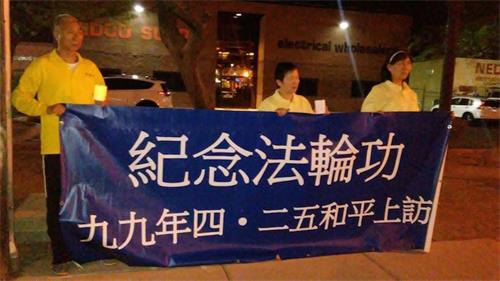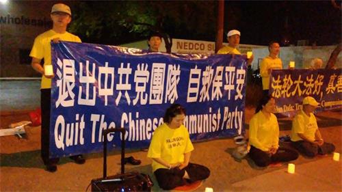 【明慧网二零一八年四月二十四日】二零一八年四月二十二日晚,有“世界娱乐之都”美誉的拉斯维加斯温度宜人,微风拂面。本地法轮功学员赴春山路的中国城,于马路对面的人行道上集体炼功,并拉起真相横幅,举行烛光夜悼,纪念中国大陆法轮功学员“四·二五”和平上访十九周年,要求中共停止对法轮功的迫害