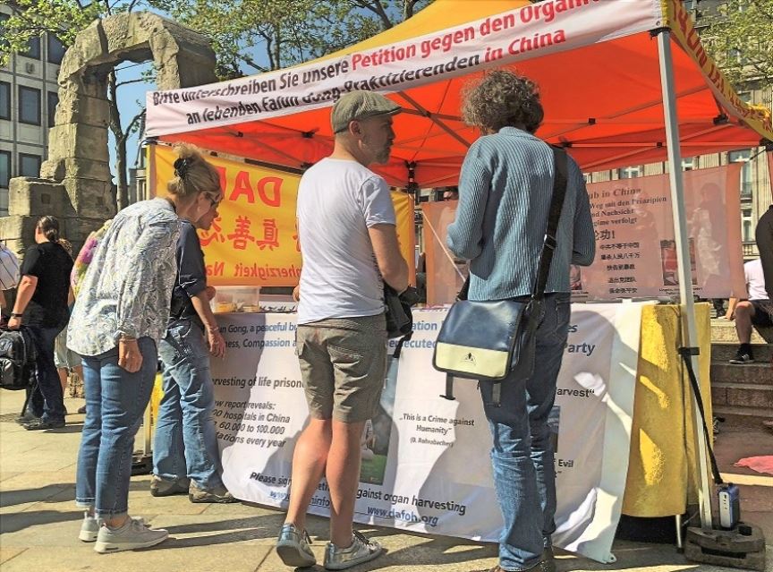 一位年轻的亚洲男子站在真相点前,静静的看着学员炼第五套功法。他是在德国出生,祖籍是香港的华裔。他告诉法轮功学员说:“我已经知道法轮功和中共的迫害。” 他无法理解中共为什么迫害这么一群和平的人。和他同行的还有两位年轻的德国女士,她们从学员那里了解到真相后,都对中共的迫害感到很震惊。他们三个人在制止迫害征签表上签了字。这位年轻华裔临走时对学员说:“谢谢你们,祝你们成功!”