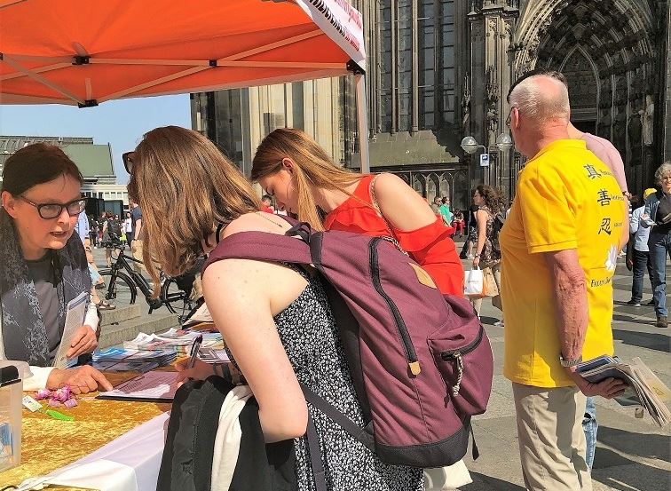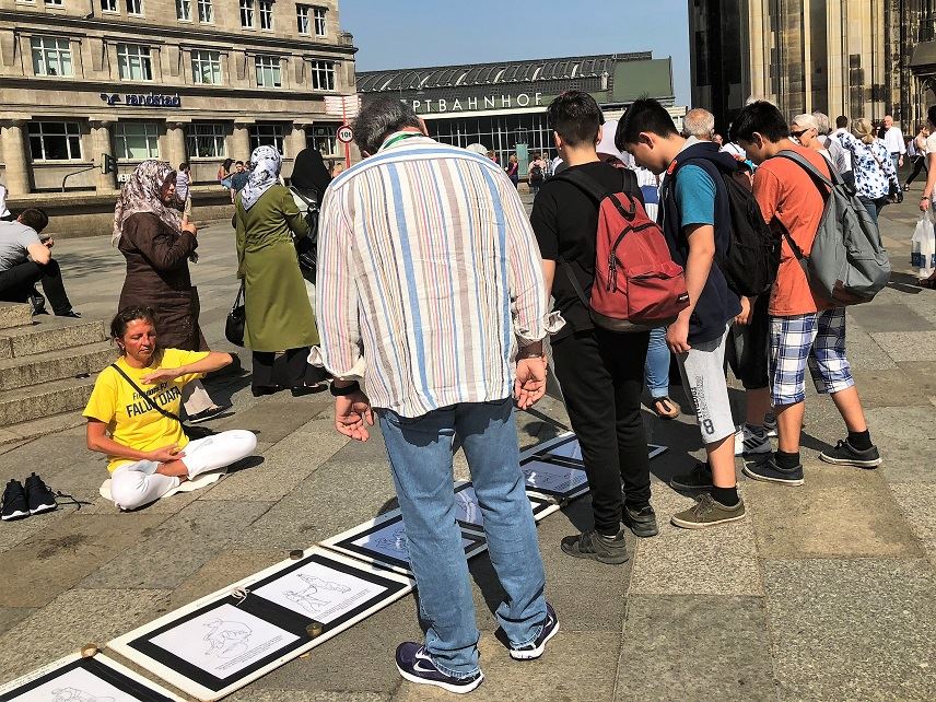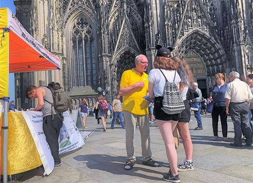 德国中部的法轮功学员从二零零零年起就定期在这个世界各国游客驻足的地方讲真相,十八年来从未间断。在大教堂深灰背景的映衬下,法轮功真相点上祥和的炼功音乐,醒目的图片展板和身着黄衣的炼功人更加醒目,吸引着来自世界各地的游客。