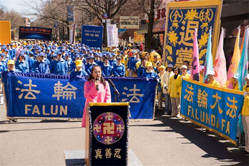 刚逃离中国仅二个月的大陆民主人士张林在集会发言时说:看到这么盛大集会觉得很感动,也为法轮功所遭受到的迫害感到不平。他说世界动荡最厉害的地区都是共产党统治过的。从一九一七年十月共产党在俄罗斯发动第一次暴乱以来,百年间给人类带来了无穷祸害。
