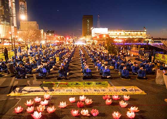 四月二十二日傍晚,大纽约地区千名法轮功学员来到位于曼哈顿的中领馆对面,举办烛光守夜,悼念被中共残酷迫害致死的法轮功学员,要求中共立即停止迫害。
