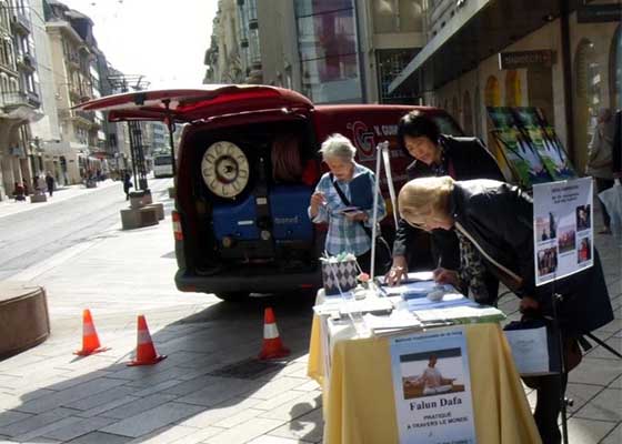 为了纪念“四二五”十九周年,瑞士法轮功学员在日内瓦市中心,向世人发放介绍法轮功的材料,并且揭露中共对法轮功学员的残酷迫害。