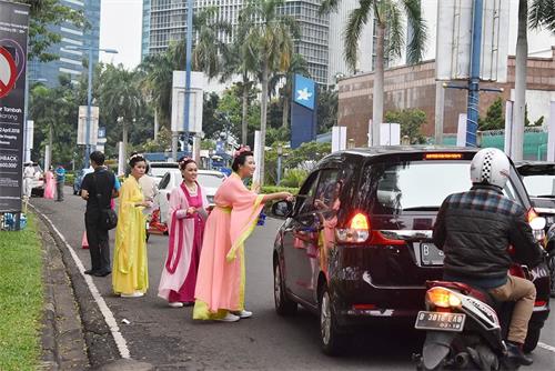 在首都雅加达,活动现场挂出了很多真相横幅,路过的很多坐在车里的路人纷纷降低车速拉下车窗,接过法轮功学员们的真相传单或者自制的莲花。还看到全身金黄色穿着,演奏中国式的腰鼓队,阵阵的鼓声,吸引不少人来拍摄,连值班的警员也来拍摄留念。每年类似的活动,都是在告诉更多的民众关于法轮功的真相,以及中共非法对法轮功学员的迫害罪行。