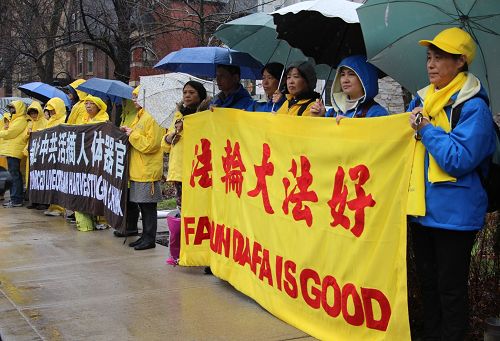 风雨中,学员们静静地看着对面的中领馆。当年亲身经历过“四二五”的学员,十九年前上访时,他们中很多当时还是五十多岁,现在都七、八十岁了,他们说:“我们只是想要一个合法的修炼环境,中共就残暴的迫害了我们十九年!”