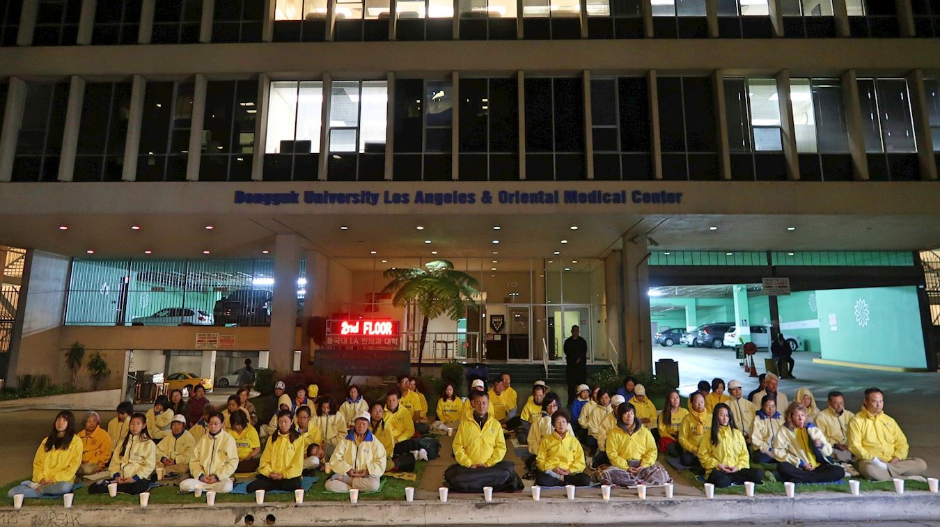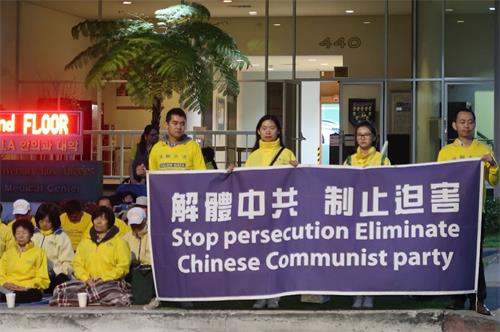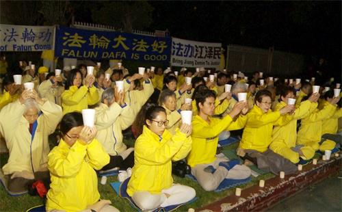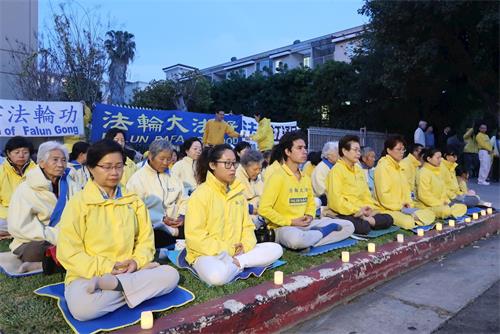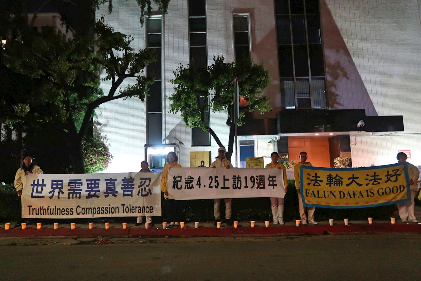 【明慧网二零一八年四月二十六日】二零一八年四月二十三日傍晚,在太阳的余晖中,夜幕降临,气温略显寒意,美国洛杉矶部份法轮功学员聚集在洛杉矶中领馆前举行烛光守夜,纪念“四·二五”和平上访十九周年,并要求中共停止对法轮功的迫害,呼吁法办江泽民。