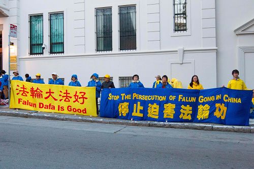 夜幕降临,法轮功学员在中领馆前打着的横幅上写着“四二五和平上访铸就人类道德丰碑”、“停止迫害法轮功”、“全民起诉迫害元凶江泽民”。也有学员在领馆前炼功,或派发真相资料,呼吁人们关注在中国发生的迫害。行人接过传单了解了真相后,对法轮功和平反迫害表示支持。