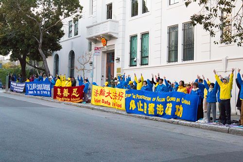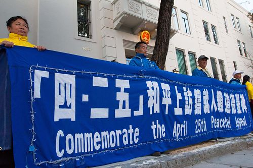 ![]() 图1~5:四月二十五日晚,旧金山法轮功学员在中领馆前纪念“四·二五”和平上访十九周年。 |