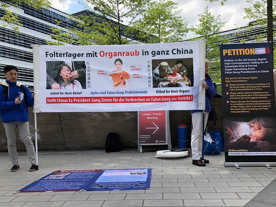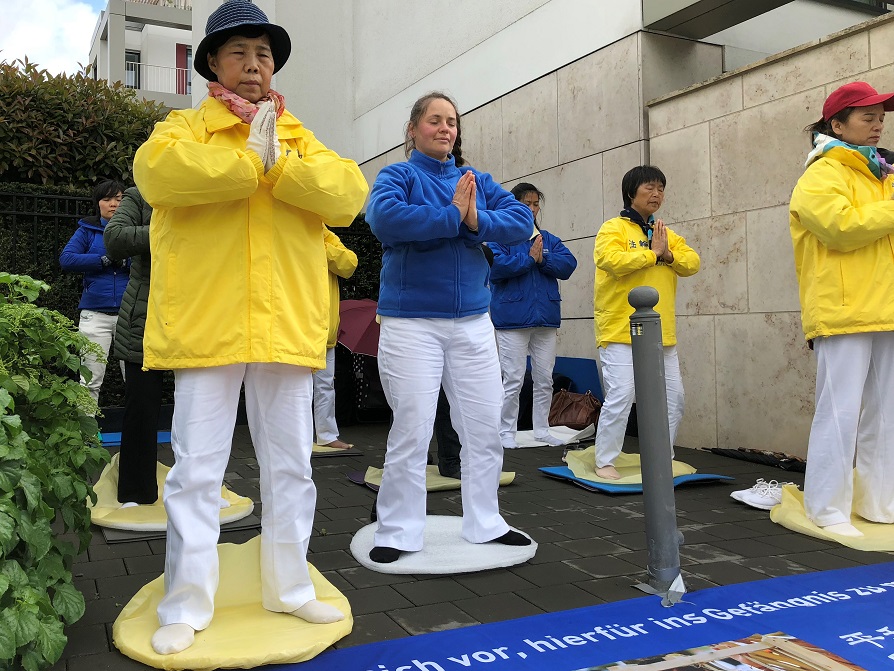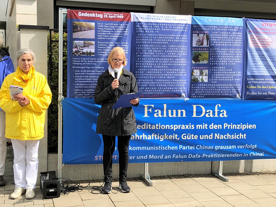 四月二十五日九点至十二点,法轮功学员在中领馆对面拉开以纪念四·二五和平上访为专题的横幅,并集体炼功,发正念。法轮功学员本特纳女士(Bentner)通过扩音器向中领馆工作人员及所有在场民众朗读了一封给驻杜塞尔多夫总领事冯海阳的公开信。