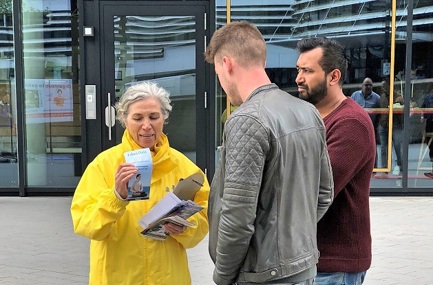 一位穿西装的男士对学员讲,他能回忆起迫害发生时德国媒体也受了中共影响,对法轮功有过不符合事实的报道。他说:“我还一直想,那个报道怎么没有下文了呢?今天看到你们我才知道事情的发展。“他和学员聊了十几分钟,临走时向学员道谢。